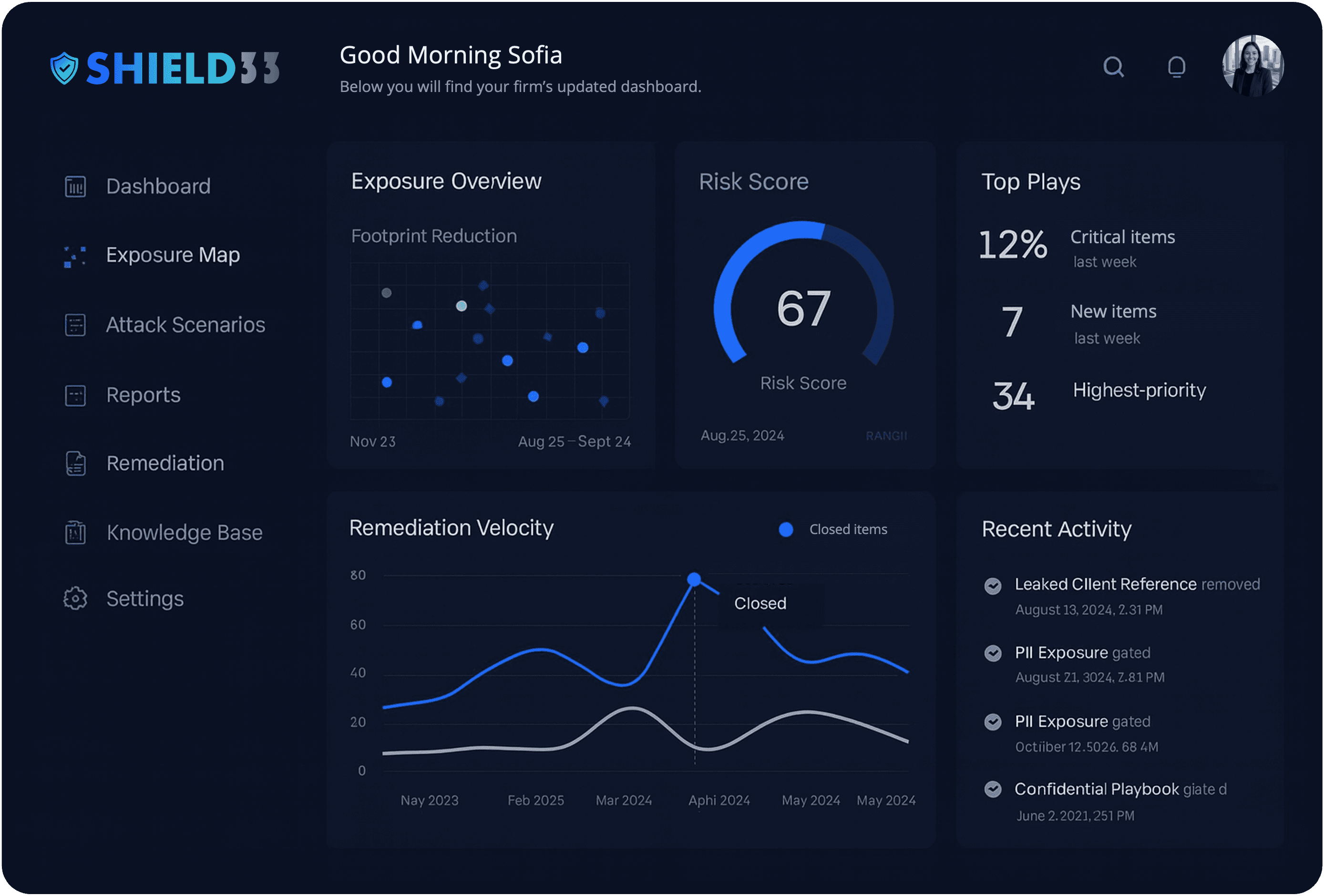 Built for CISO and Chief Legal Officer teams at 100+ FTE professional services firms, Shield33 turns sensitive data leaks into a prioritized remediation backlog so you can prevent confidentiality breaches, reduce exposure to sophisticated AI-powered social-engineering attacks, and prove to clients and the board that you’re in control.